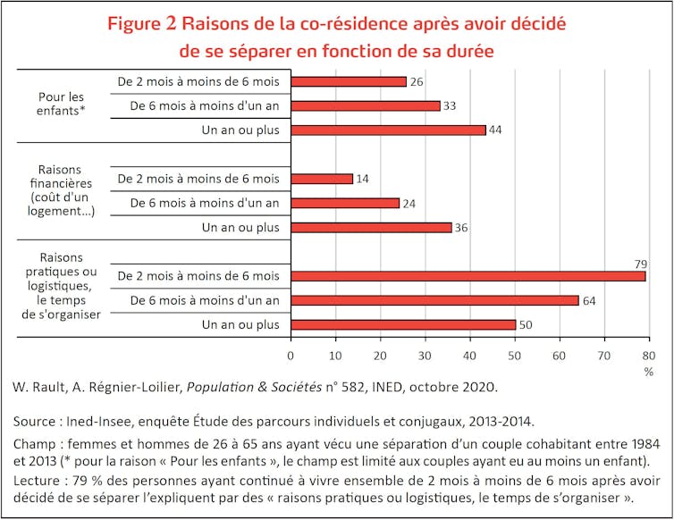 Les personnes ayant continué à vivre ensemble après avoir décidé de se séparer étaient interrogées sur les raisons qui les avaient conduites à cette situation (plusieurs raisons pouvaient être avancées). Le motif le plus fréquent est d’ordre « pratique ou logistique, le temps de s’organiser » (70 %). « Pour les enfants » arrive ensuite (24 % de l’ensemble des couples séparés, 33 % de ceux ayant eu au moins un enfant ensemble) devant les raisons d’ordre « financier » (21 %).